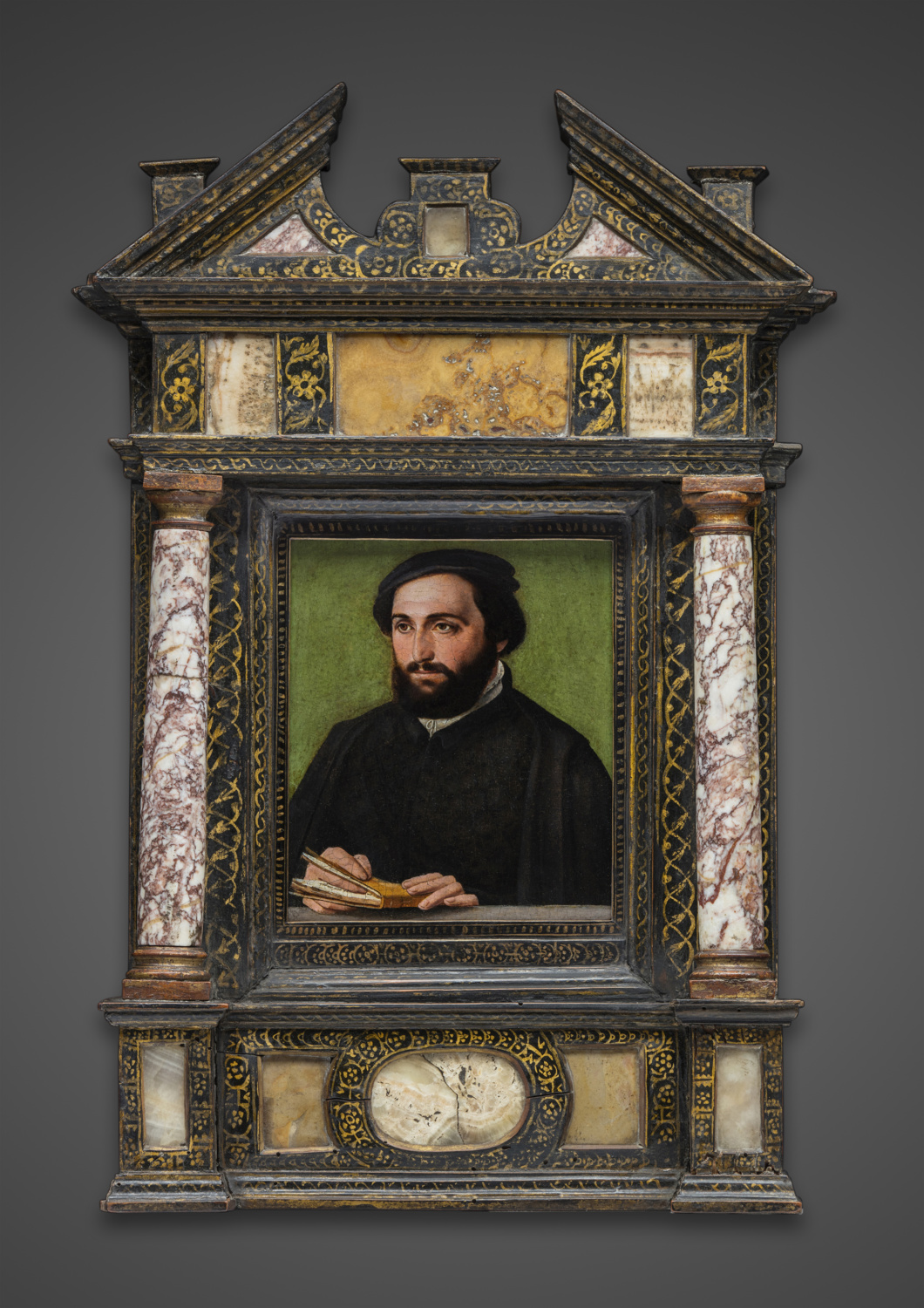 The present portrait, as remarkably delicate as a miniature, can be compared to the work of Corneille de la Haye, known as Corneille de Lyon, due to the small size of the panel and the light green background. Several artists were working in a similar style, whether or not directly influenced by Corneille, making it difficult to settle on a firm attribution.